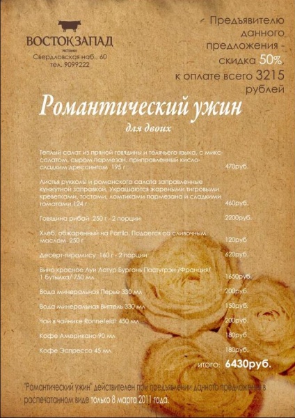Только 8 марта действует специальное предложение: романтический ужин со скидкой 50%.