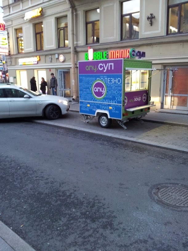 Горячим уличным питанием петербуржцы не избалованы. Сосиска в тесте – едва ли не единственная возможность подкрепиться на ходу если не горячим, но хотя бы теплым продуктом. Первый уличный киоск «any.soup» заработал в середине октябре в Петербурге в Кирпичном переулке напротив станции метро «Адмиралтейская». Соучредитель проекта – Антон Королев – также является совладельцем двух ресторанов итальянской кухни «any.pasta», работающих на пешеходной линии В.О. и с недавних времен на Невском проспекте, 11.