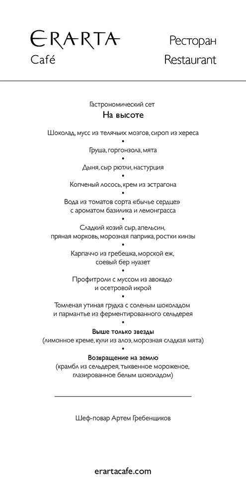 В «Erarta Café», что располагается в цокольном этаже музея современного искусства «Эрарта», давно превращают еду в событие. Но тематический гастрономический сет запускают впервые. Первый сет из одиннадцати курсов шеф Артем Гребенщиков посвятил фотовыставке «На высоте» - работы руферов Вадима Мазорова и Виталия Расковалова, сделанные на огромной высоте в труднодоступных местах в различных частях мира. Впечатления от панорамных видов на Шанхайскую башню и небоскребы Манхеттена шеф-повар постарался передать гастрономическими средствами.