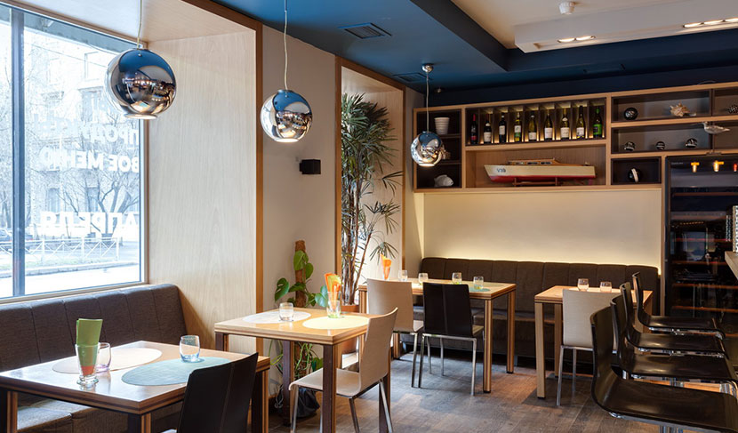 Интерьер ресторана стал легче, невесомее - потолок поменял цвет и стал тематически темно-синим, увеличилась в размерах контактная барная стойка. Главная системообразующая деталь теперь - аквистема для содержания моллюсков, так в меню появился новый раздел «Живые морепродукты». В соседнем аквариуме фланирует стерлядь, а собственно в аквасистеме проживают десяток видов устриц от сахалинских до средиземноморских, морские ежи и мурманский гребешок.