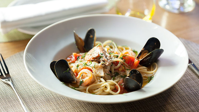 Среди новых блюд значатся спагетти с мидиями и карпаччо из дорадо, ризотто с чернилами каракатицы. Плюс редкий зверь в нашем городе - анадара, обладающий тонизирующим свойством моллюск, который сервируется в компании с собственной кровью. Из непрофильных позиций внимания заслуживает венский шницель из свиной корейки с красной тушеной капустой. А каждое воскресенье в три часа дня в зал выносят большую сковороду с паэльей «Mare e Montagna» с курицей, свининой, кальмарами, мидиями и вонголе - и угощают каждого гостя.