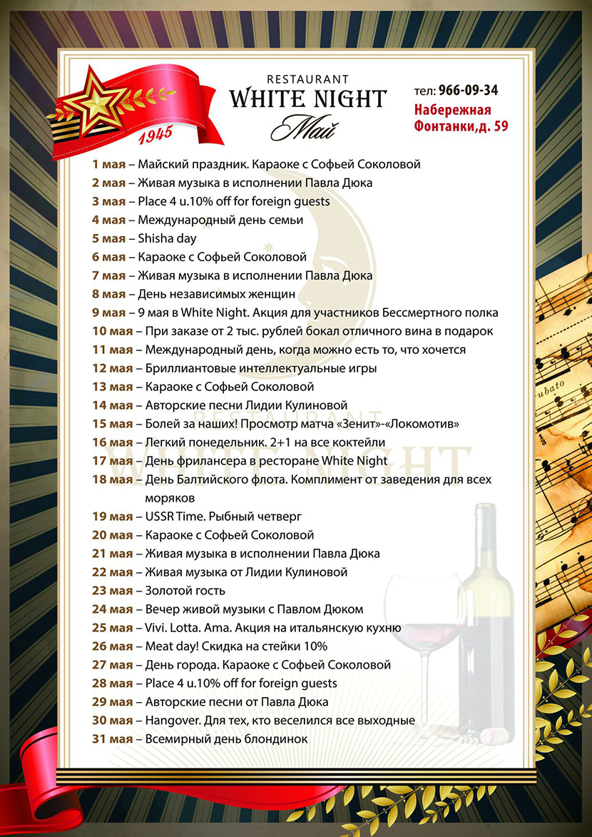 В течении всего месяца Вы можете почувствовать себя звездой Белой Ночи. Любые песни по вашему желанию. Отличная акустика, приятный интерьер и вкусные блюда. Все это вы найдете в ресторане «White Night».