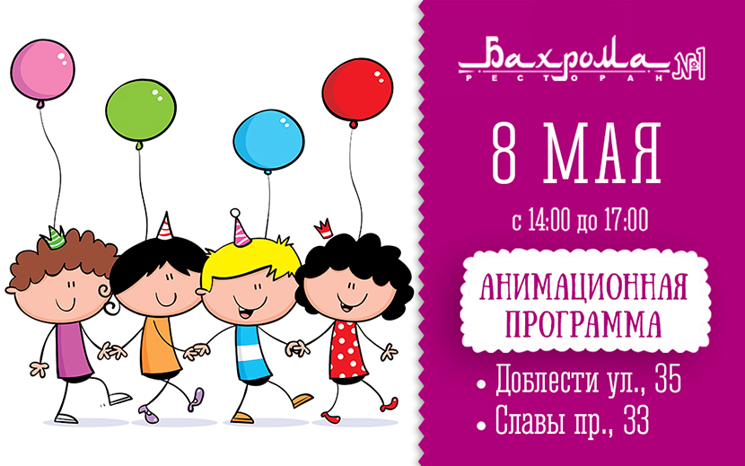 Дорогие родители! Приглашаем вас и ваших малышей 8 мая в рестораны «Бахрома №1» по адресам: Доблести ул., 35 и Славы пр., 33. Маленьких гостей ждет интерактивная анимационная программа: игры, надувные шарики, твистинг, аквагрим. Приходите, будет весело и занимательно!