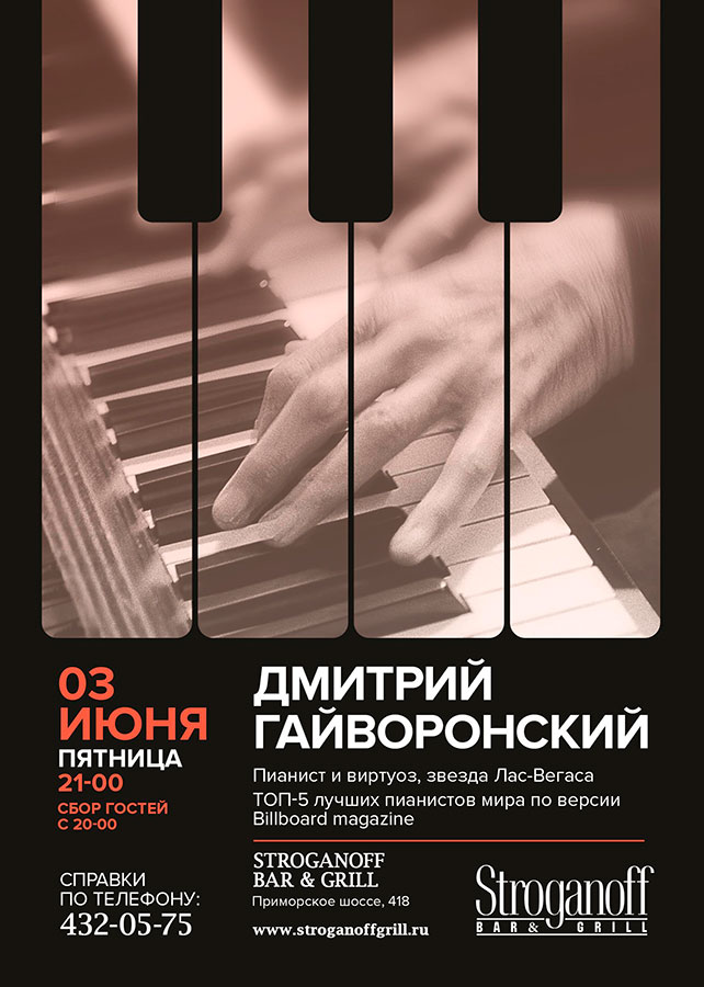 Если Вам по душе фортепианные мелодии, исполненные профессионалом высокого класса, тогда приглашаем Вас 3 июня на концерт Дмитрия Гайворонского в ресторан «Строганов Бар и Гриль».