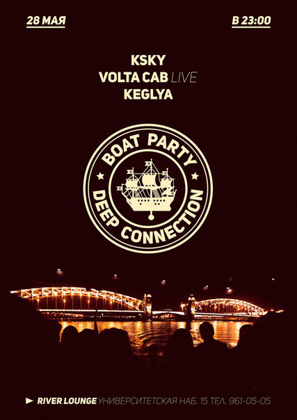 Начиная с 28 мая и каждую субботу лета, Deep Connection и «River Lounge» снова вместе. Мы ждем всех джентльменов и красоток, неравнодушных к хаус-ритмам и веселым прогулкам по ночной Неве. Две палубы стиля, демократичный бар, фирменное питерское лето и топовые артисты - это наш план на сезон. Присоединяйтесь!