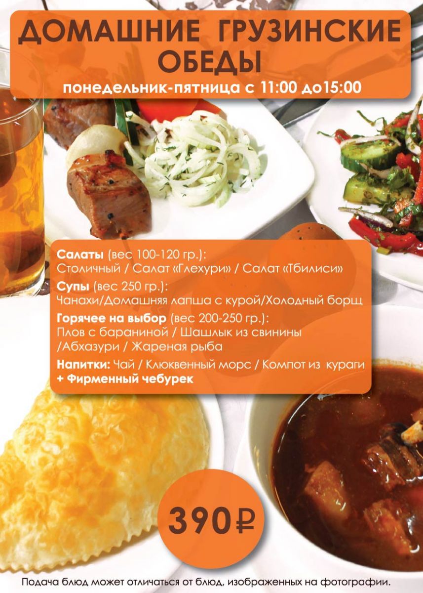 Стоимость домашнего грузинского обеда – 390 рублей. Причем хочется обратить особое внимание на один момент - повара ресторана не делают никаких скидок на то, что это обеденное предложение, все блюда такие же вкусные и ничем не отличаются от блюд из «вечернего» меню.