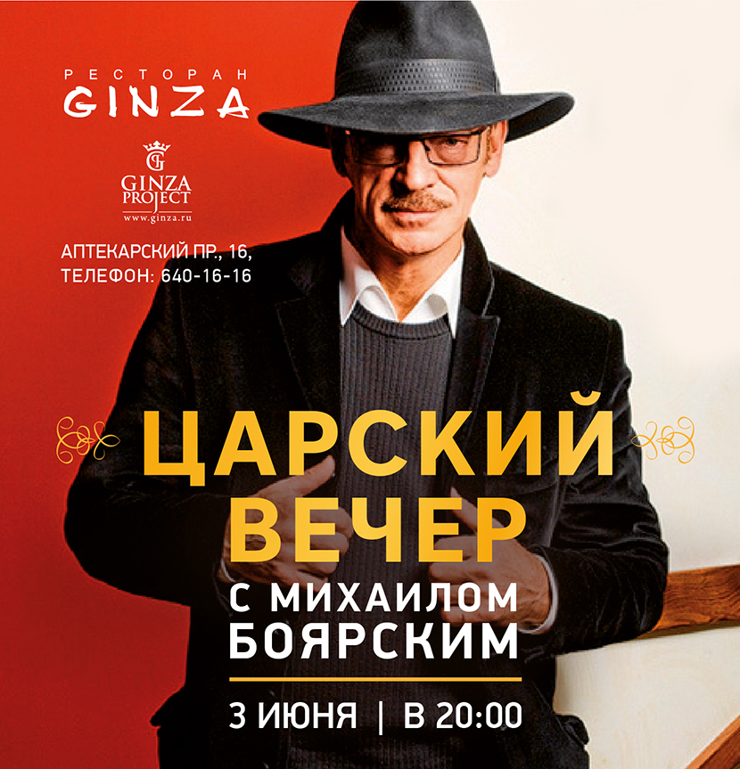 На царском вечере в ресторане «Ginza» Михаил Боярский споет и сыграет песни, любимые миллионами.