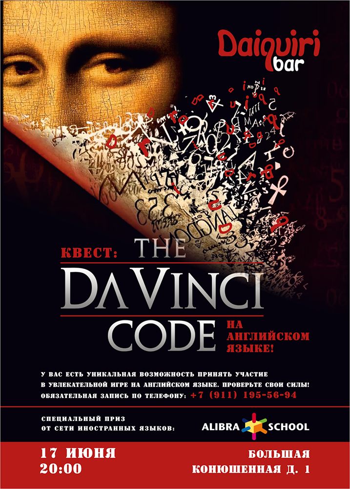 17 июня в 20:00 в «Daiquiri bar» у вас будет уникальная возможность проверить свои знания и поучаствовать в увлекательном квесте «Код да Винчи» на английском языке.
