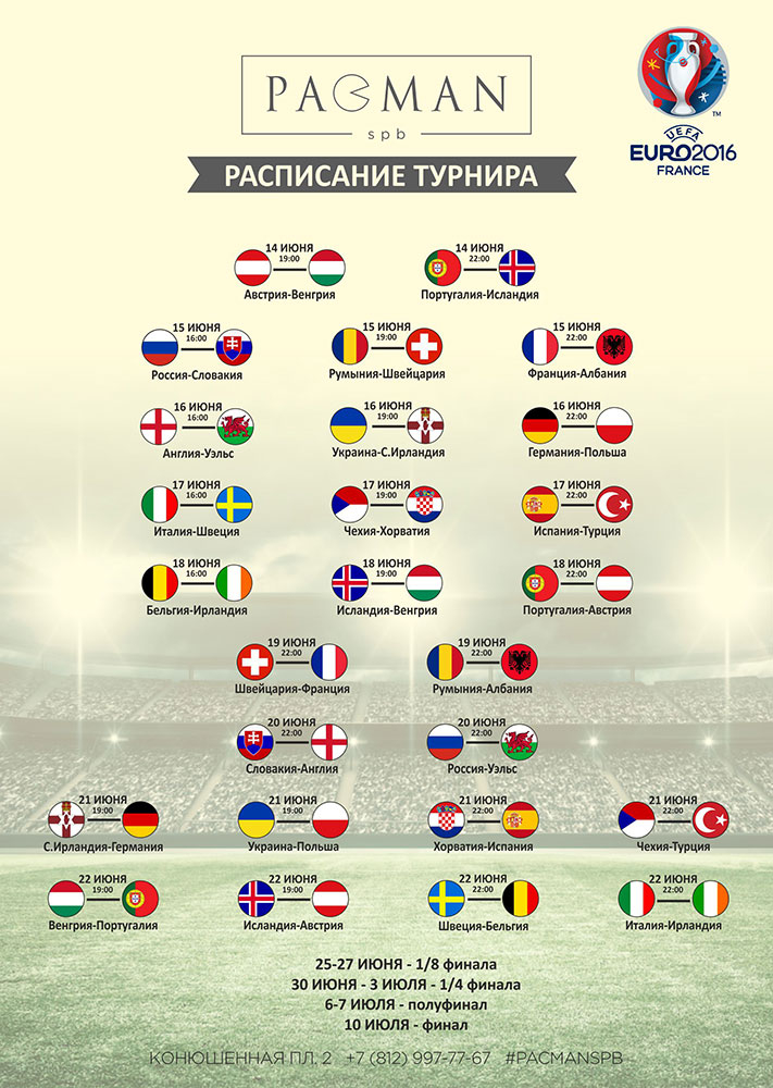 Вечера в «Pacman» проходят не только за зажигательными вечеринками и танцами. Мы не смогли остаться в стороне и поддались общему восторгу, в котором и пребываем, наблюдая за чемпионатом Европы по футболу, который обещает стать самой зрелищной схваткой этого года в мире большого спорта! Стадионы Франции взрываются от громогласного оле-оле-оле, а мы предлагаем вам остаться на родных просторах и следить за всеми играми чемпионата в уютном интерьере «Pacman», дополняя свой вечер бокалом изысканного вина в дуэте с вкуснейшим ассорти из сыров!