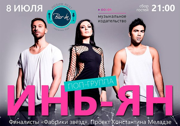 Финалист седьмого сезона российского проекта «Фабрика звёзд», этот коллектив основан продюсером и композитором Константином Меладзе. За провокационный сингл «Пофиг» (2010) и клип на него - более 20 млн просмотров в YouTube на конец февраля 2015 года - группа получает широкую известность. Песни «Камикадзе», «Сохрани меня», «Мало по малу» попадали в топ-15 самых ротируемых треков по данным портала TopHit. Клип на песню «Круто», автором которой стал солист группы Артем Иванов, вызвал всплеск восторга у поклонников. Сейчас участников «Инь-Ян» сложно ассоциировать с «фабрикантами», но карьера их началась именно на этом самом рейтинговом проекте тех лет. Они стильные, модные, красивые, уверенные в себе музыканты с огромным музыкальным опытом и плотным гастрольным графиком. 8 июля они выступят на сцене караоке-бара «Bar-In»! Приглашаем Вас на концерт и уверены, Вы – не пожалеете! Количество мест – ограничено.
