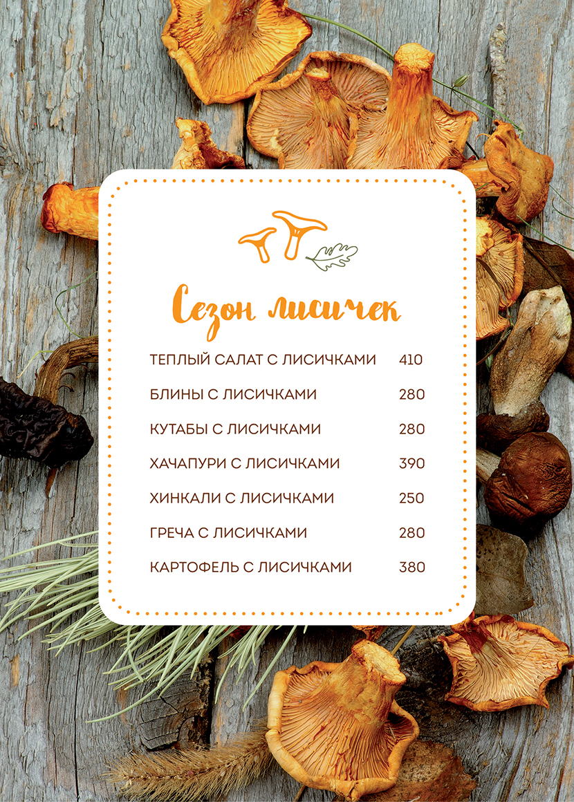 Вы можете выбрать теплый салат, а также гречу или картофель с лисичками. Захотелось блинчиков? Оцените необычный вкус любимого блюда с начинкой из лисичек. И, конечно же, как ресторан грузинской кухни мы не можем обойтись без кутабов, хачапури и хинкали с лисичками.