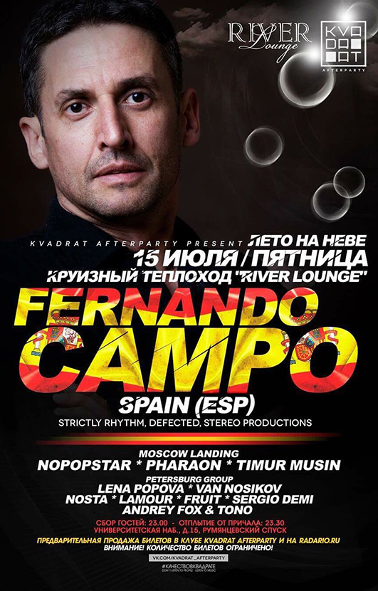Как вы и ждали: немного испанского саунда на «River Lounge»! В эту пятницу на волнах Невы один из самых известных дискжокеев Испании – Fernando Campo. Герой топов музыкальных магазинов электронной музыки и верхних строчек чартов от мировых лейблов!