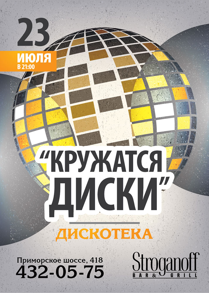 Для тех, кто любит проводить выходные весело и со вкусом, кто любит хорошую музыку и отличную компанию! 23 июля мы приглашаем вас в загородный ресторан «Строганов Бар и Гриль» на яркую дискотеку «Кружатся Диски».