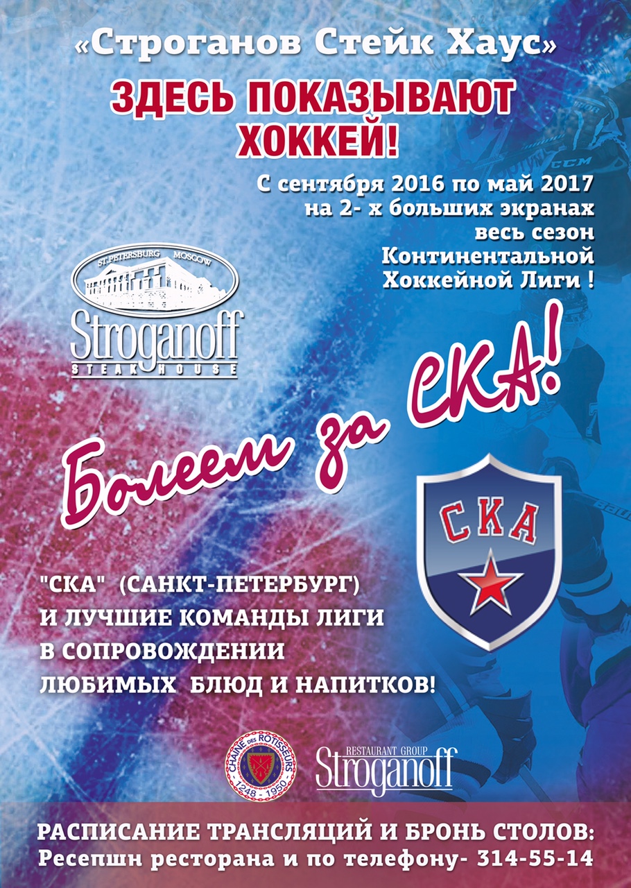 С сентября 2016 по май 2017 года в ресторане «Строганов Стейк Хаус» на 2-ух больших экранах будут вестись трансляции игр Континентальной Хоккейной Лиги. Гости ресторана смогут не только поболеть за лучшие команды лиги, но и насладиться разнообразным меню, которое станет отличным дополнением вечера.