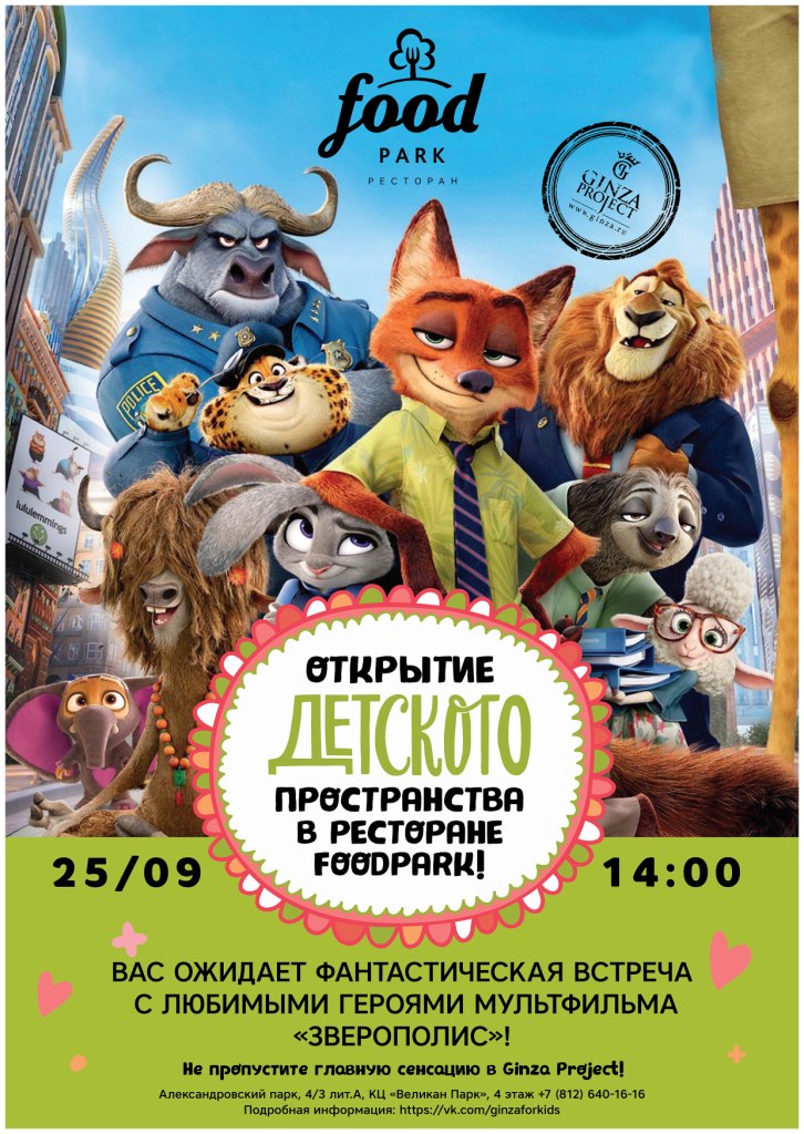 25 сентября в 14:00 — открытие детского пространства в ресторане «Food park» Трехкратное ура, ведь в нашем ресторане наконец-то открывается волшебное детское пространство, где каждый маленький непоседа найдет себе занятие по душе! Мы долго ждали, когда же эта комната приобретет самый сказочный вид, и не можем не отпраздновать такое радостное событие. 25 сентября мы приглашаем всех гостей ресторана отправиться в увлекательное путешествие по таинственному Зверополису: вместе с смелой крольчихой Джуди Хопс и хитрым лисом Ником Уайльдом вы попадете в центральный парк Нью-Йорка, ведь, как говорит наш ушастый друг, жизнь в этом мегаполисе просто мечта! Каждому ребенку на входе вручат специальный значок полицейского, а с помощью веселого аквагрима маленькие гости ненадолго перевоплотятся в животных этого невероятного города зверей. Запечатлеть свои звериные мордочки ребята смогут в яркой фотозоне в компании любимых героев, чтобы уже дома с радостью вспоминать об этом удивительном приключении. Бумажное шоу, пиньята со сладостями, шумная дискотека — все это и многое другое ждет вас на нашем детском празднике в ресторане «Food park»!