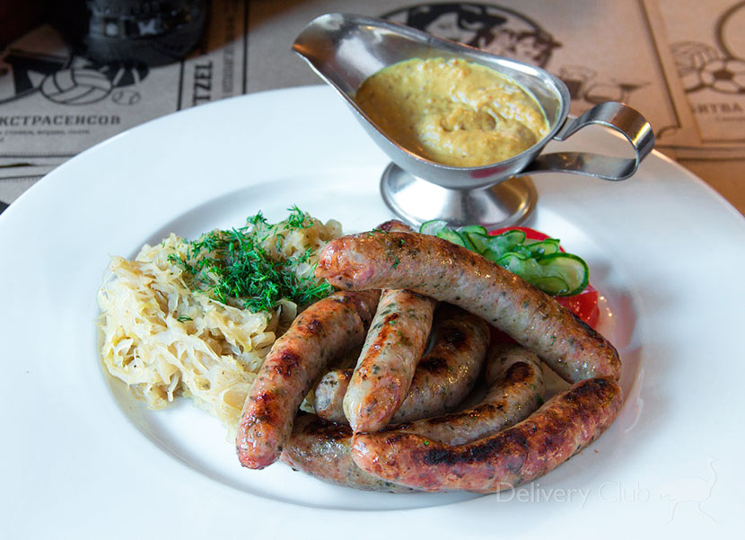 - Шесть жареных свиных сосисок с домашней горчицей и квашеной капустой – 490 руб.