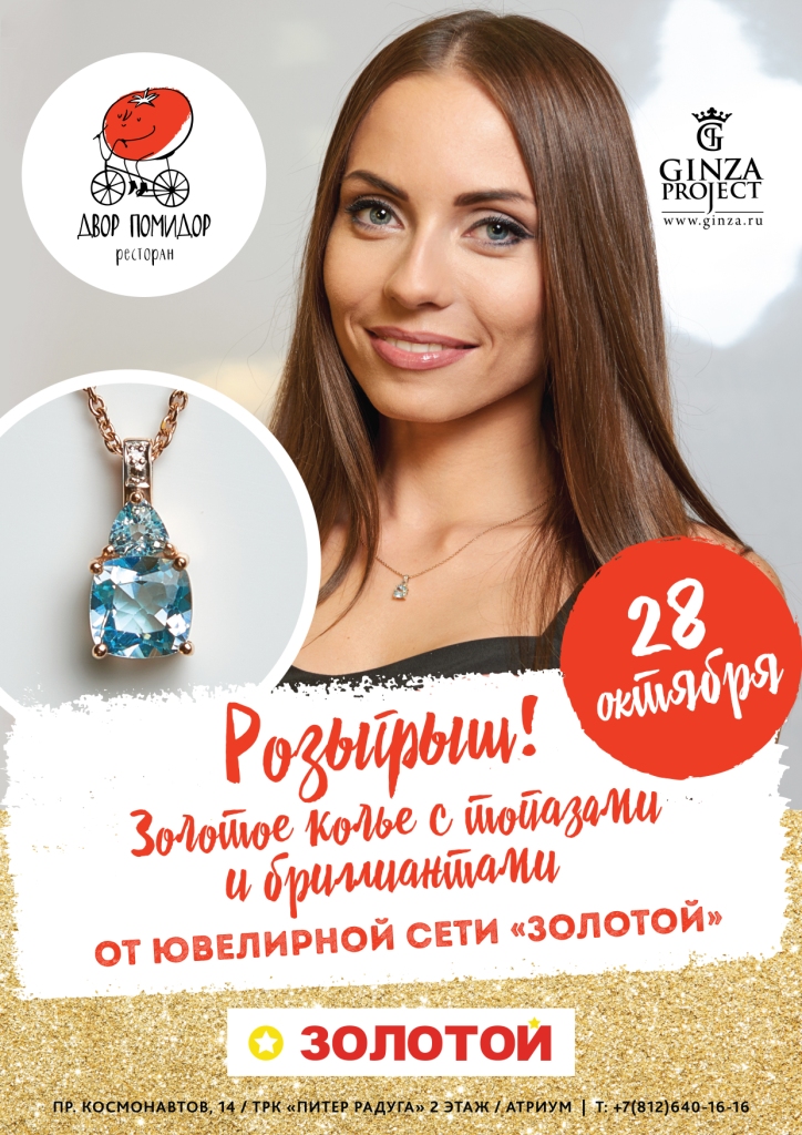 Широта кавказской души ресторана «Двор Помидор» не знает никаких границ: мы объявляем розыгрыш золотого колье с топазами и бриллиантами от ювелирной сети «Золотой». И как всегда, правила просты: