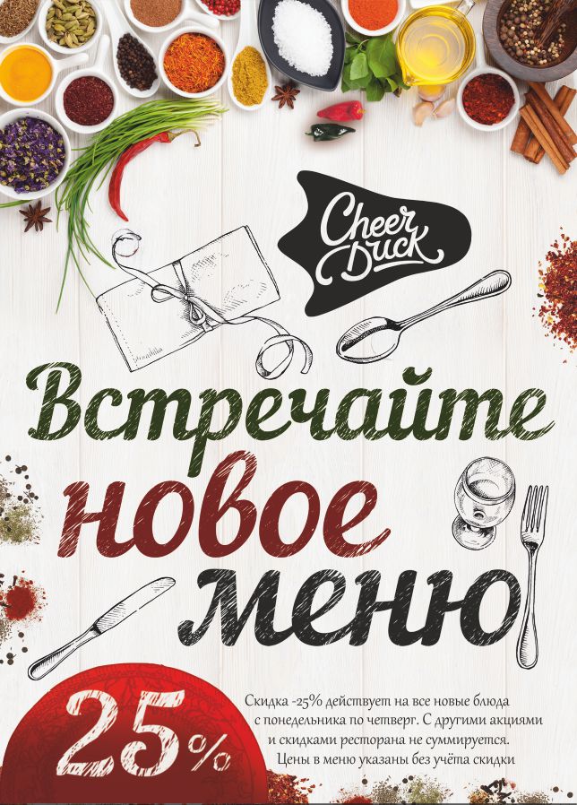 *Скидка -25% действует на все новые блюда с понедельника по четверг. С другими акциями и скидками ресторана не суммируется. Цены в меню указаны без учёта скидки.