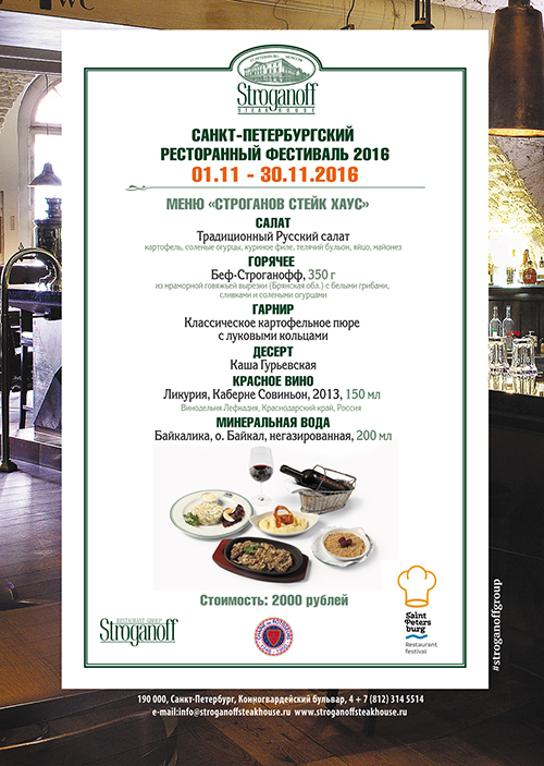 В «Строганов Стейк Хаус» предложат традиционный русский салат, беф-строганофф, классическое картофельное пюре с луковыми кольцами, Гурьевскую кашу, вино и минеральную воду.