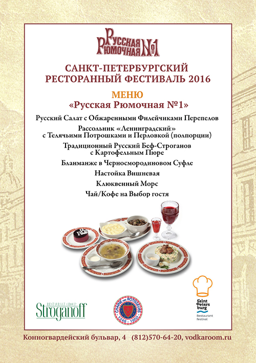 А «Русская Рюмочная №1» угостит своих гостей русским салатом с филейчиками перепелов, рассольником «Ленинградским» с телячьими потрошками, Беф-строгановым с картофельным пюре, бланманже в черносмородиновом суфле, вишневой настойкой, клюквенным морсом, чаем или кофе на выбор.