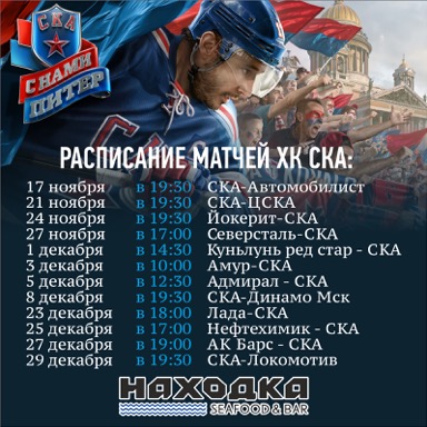 В seafood-баре Находка проходят прямые трансляции всех домашних и выездных матчей СКА. Это прекрасный повод собраться с друзьями, насладиться долгожданными матчами со звуком в комфортной обстановке за вкуснейшими креветками и пенными напитками в seafood-баре «Находка» - что может быть лучше?