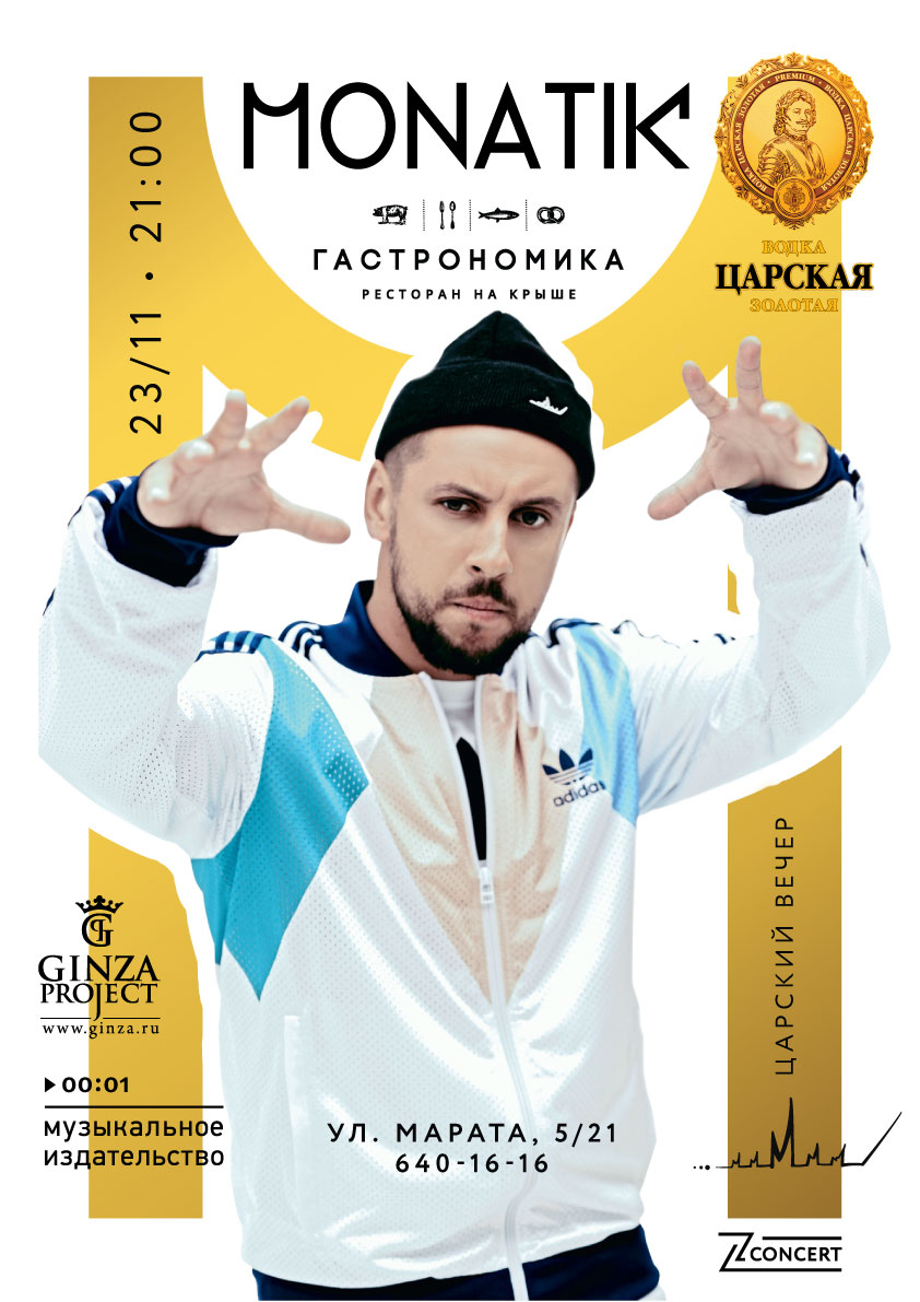 Популярный певец Дмитрий Монатик выступит со своим концертом в Петербурге в самом высоком ресторане сети Ginza Progect. Сейчас многие называют этого молодого певца мультиартистом, так как он не только поет, но и профессионально танцует, а также пишет песни для себя и известных исполнителей: Анны Седоковой, Lobod'ы, Quest Pistols Show и т.д. Его известные хиты «Дым», «Мокрая», «Сон» все чаще звучат в радиоприемниках.