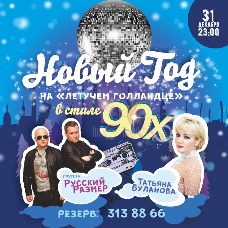 Новогодняя тусовка развернется на всех палубах Летучего Голландца. Масштабные декорации перенесут Вас во времена кассетных магнитофонов, приставок Dandy и Sega, культовых сериалов, блокбастеров и неповторимых прикидов.