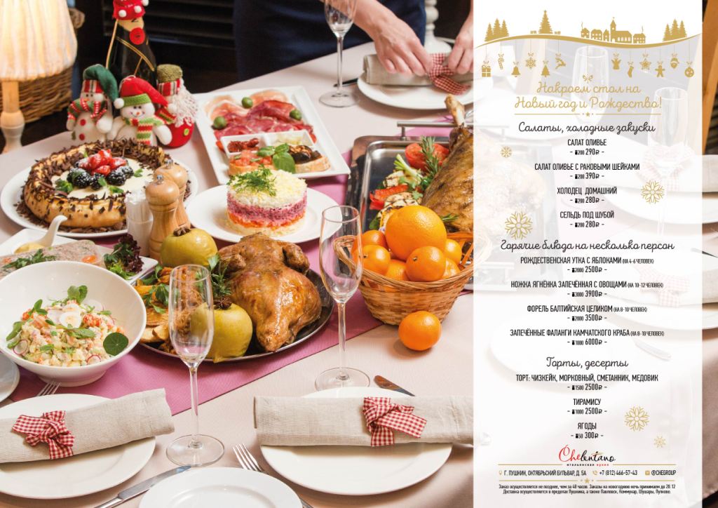В меню традиционные салаты: селедка под шубой, оливье с раковыми шейками, холодец, горячие закуски и блюда: утка с яблоками, баранья нога, барашек целиком, запеченные фаланги камчатского краба и многое другое! А десерт - торты и свежие ягоды также станут отличным добавлением к празднику.