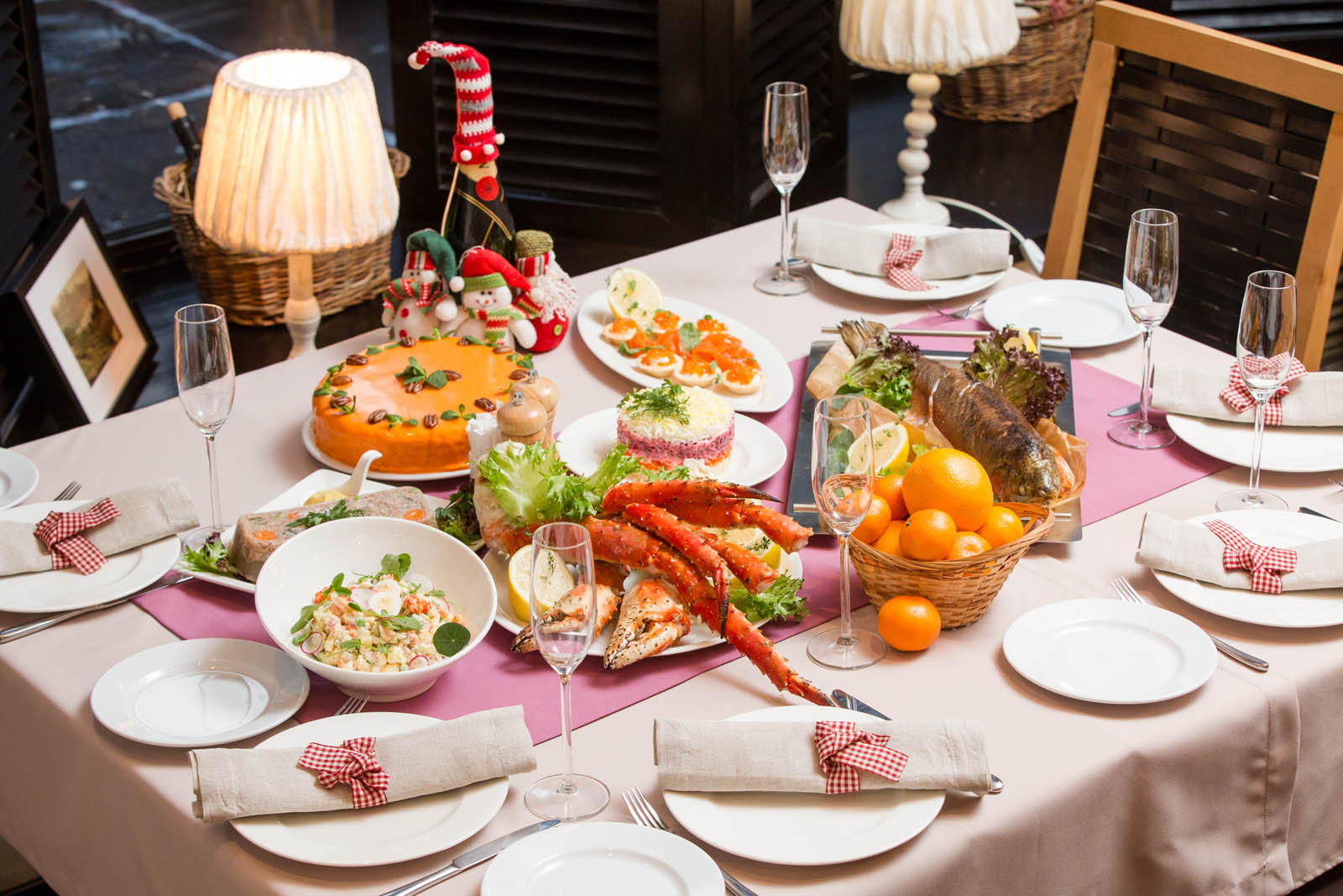 В меню традиционные салаты: селедка под шубой, оливье с раковыми шейками, холодец, горячие закуски и блюда: утка с яблоками, баранья нога, барашек целиком, запеченные фаланги камчатского краба и многое другое! А десерт - торты и свежие ягоды также станут отличным добавлением к празднику.