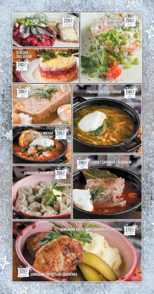 Каникулы закончились, а зима продолжается. Наше новое сезонное меню не оставит вас голодными! В меню вошли любимые новогодние блюда: оливье и селедка под шубой, а также холодец (наличие уточняйте у официанта). Супы: солянка, борщ и грибной с перловкой - согреют и насытят. Из горячего в меню - котлеты по-домашнему с пюре и пельмени ручной лепки, которые вы можете также взять в замороженном виде с собой.