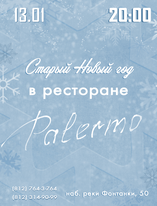 Приглашаем Вас провести старый Новый год в теплой обстановке ресторана «Палермо». Вас ждет праздничное меню и насыщенная музыкальная программа: живой эстрадный вокал специальным новогодним отделением, конкурсы и подарки от Деда Мороза, а также зажигательная дискотека.