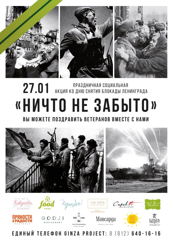 27 января в любом из этих ресторанов действует специальное меню для ветеранов, по которому можно заказать любые блюда за счёт ресторана.