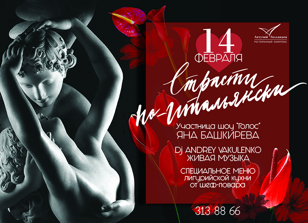 14 февраля «Летучий Голландец» приглашает всех влюбленных ощутить страсть настоящей Италии. В этот вечер создавать романтическое настроение будет обворожительная участница шоу «Голос» Яна Башкирева, а также Dj Андрей Вакуленко.