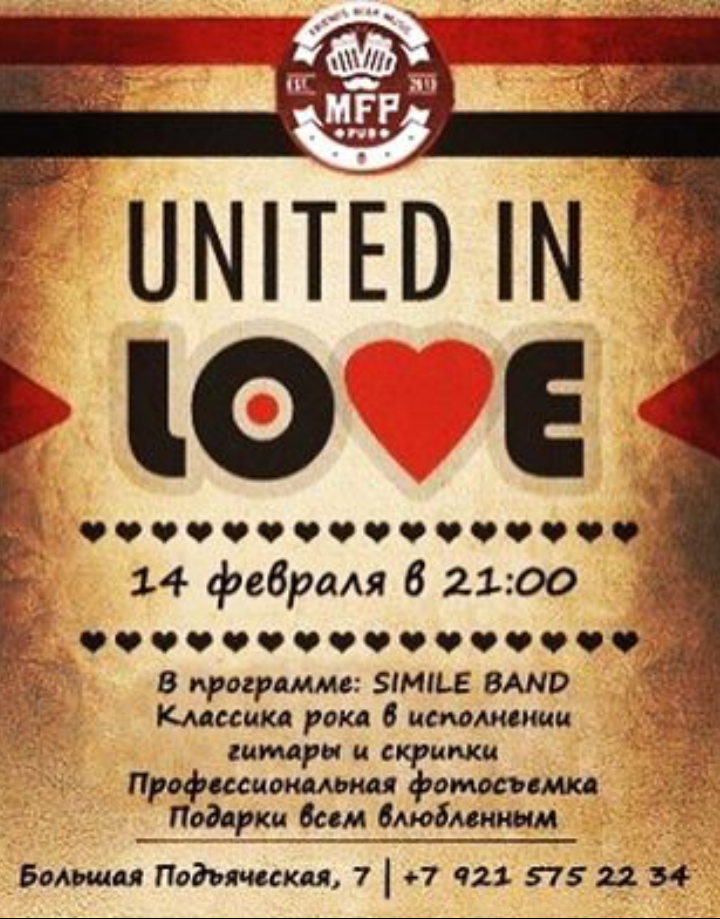 Специальные гости: гитара, скрипка и уже полюбившаяся всем группа Simileband. Много отличных и профессиональных фотографий с вечера, нам подарит наш любимый фотограф Регина Бакирова. Всем влюбленным подарки от заведения.