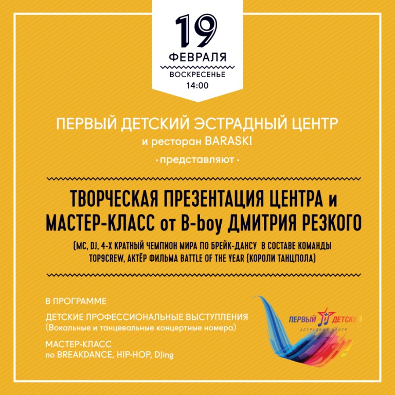 19 февраля в 14:00 в ресторане «Barashki» пройдет творческая презентация Первого Детского Эстрадного Центра. Юные звезды Центра продемонстрируют свое мастерство в вокальных и танцевальных номерах. А маленькие гости ресторана «Barashki» смогут принять участие в мастер-классах по диджеингу и хип-хопу, которые проведет 4-х кратный Чемпион мира по брейк-дансу, актер фильма «Короли танцпола» Дмитрий Резкий.
