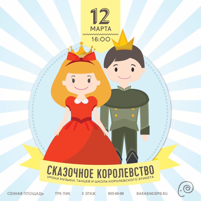 12 марта ресторан «Barashki» на один день превращается в сказочное королевство и открывает «Школа волшебства» для малышей. В «школе» маленьких принцев и принцесс будут обучать королевским занятиям: урок танцев и пластики, урок рисования, урок флористики, урок дизайна и моды и, конечно же, урок хороших манер. В сказочном королевстве будет весело, интересно и очень познавательно!
