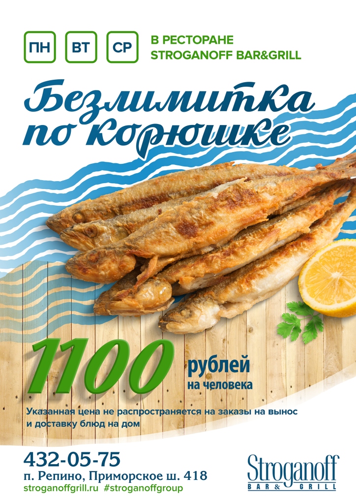 Каждый понедельник, вторник и среду ресторан «Строганов Бар и Гриль» будет радовать своих гостей свежей, хрустящей корюшкой, которую можно заказать в неограниченном количестве.