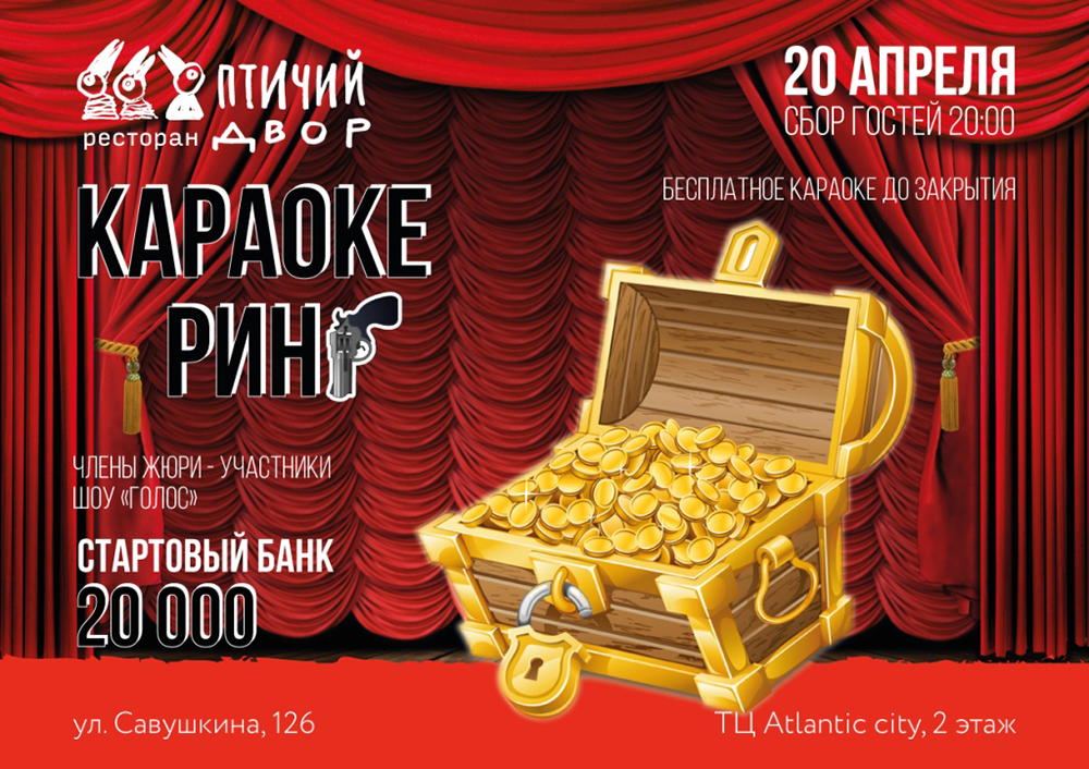 Ресторан «Птичий двор» объявляет продолжение музыкального Караоке ринга! Членами жюри станут участники шоу «Голос», а призовой фонд составит не менее 20 тысяч рублей.