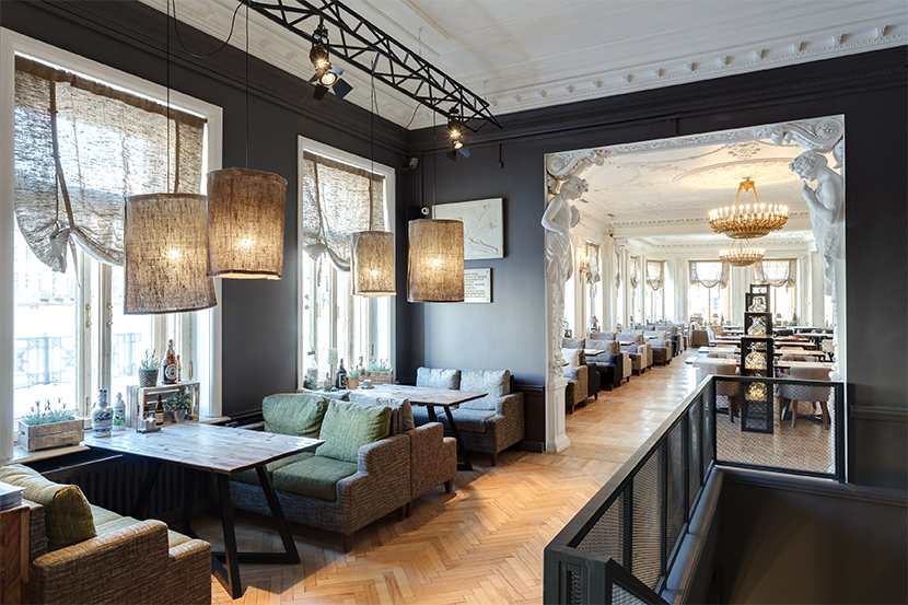 В помещении на втором этаже до 1995-го работал кинотеатр, потом до 2009-го зажигало казино клуба «Премьер», до последнего времени размещалась кофейня «CoffeеShop Company». От зрелищ к хлебу: «Beer Family», ясен хмель, история про пиво. Так думаешь, когда, не чувствуя подвоха, поднимаешься по лестнице во второй этаж, и первым делом тебя заливает свет из панорамных, глядящих на два проспекта, Невский и Владимирский, окон, видишь лепнину, и мраморные подоконники, и имперского размаха люстры. Это будто купил книжку, которая называется «Комиксы», а внутри стихи о высоком.