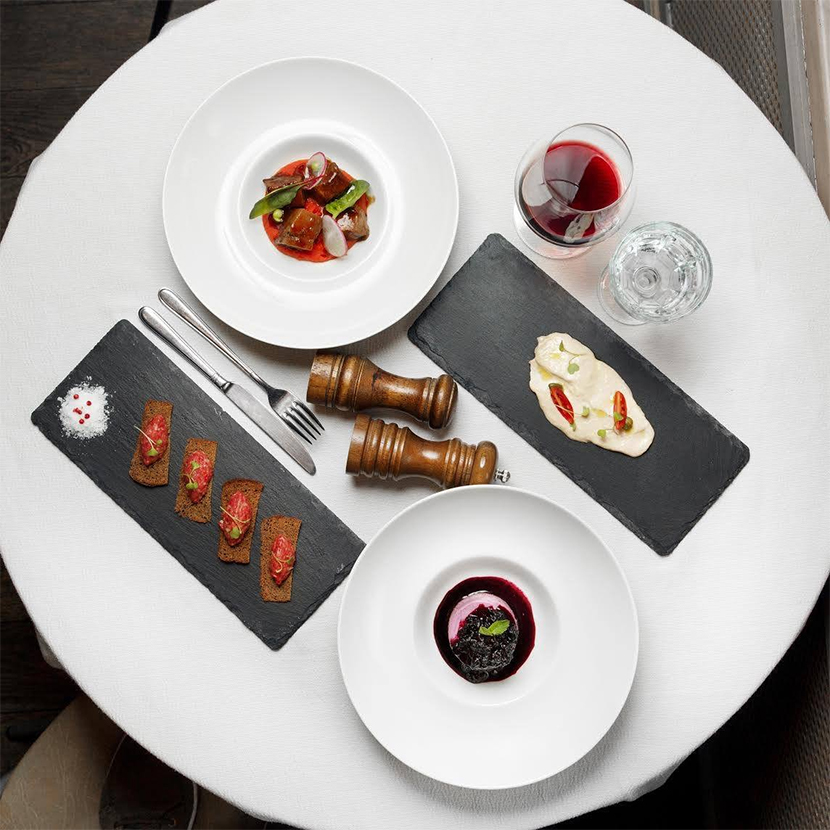 Гастрономический сет от ресторана-энотеки «Molto Вuono» и «Raw Materials Bar» на улице Жуковского был представлен в двух вариантах. Для любителей белых вин в ресторане подготовили севиче из сахалинского гребешка и подавали с нефильтрованным биодинамическим пино бланом. Гостям, выбравших красное вино, подали оленину и жженый топинамбур.