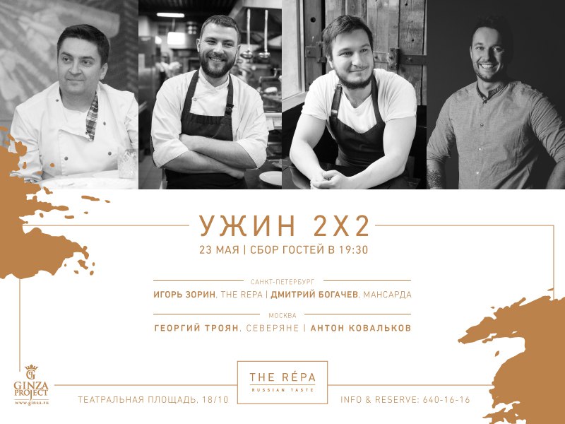 23 мая ресторан «The Repa» подготовит ужин от знаменитых шеф-поваров сразу в восемь рук. Четыре кулинарных импровизатора покорят жителей Северной столицы изысканными новинками.