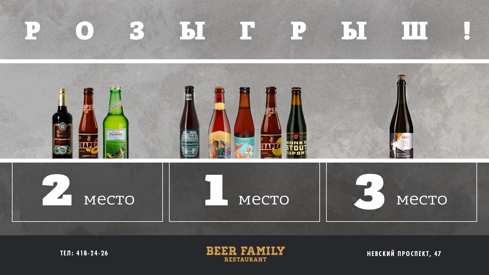 «Beer Family Restaurant» запустил розыгрыш 9 бутылок пива. Вкус по душе найдётся каждому: в конкурсе участвует и любимый всеми ценителями пенного IPA с благородной насыщенной горечью, и плотный тёмный стаут, и сливовый ламбик, и даже браун эль с ореховым послевкусием.