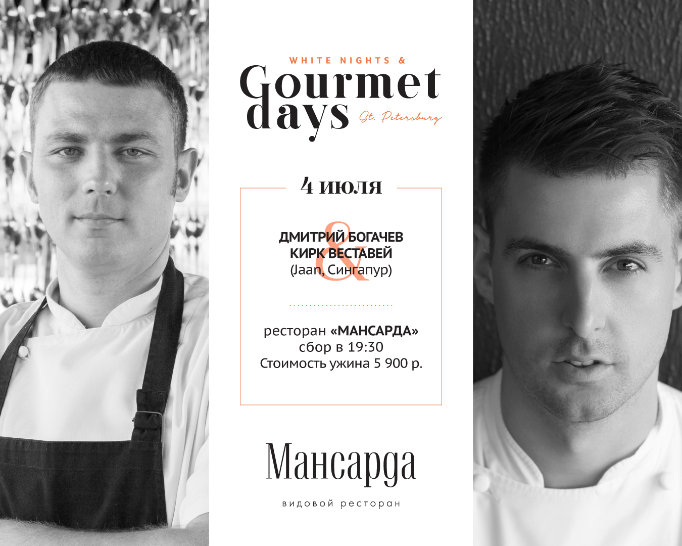 Шеф-повар «Мансарды» Дмитрий Богачёв совместно с британцем Кирком Веставеем, что отвечает за кухню ресторана «JAAN» в Сингапуре, будут удивлять гостей шедеврами французской и азиатской кухни. В первую очередь акцент блюд будет поставлен на современные веяния: Кирк Веставей за свой путь успел заработать для ресторана звезду Мишлен и 42 место в рейтинге Asia’s 50 Best, а Дмитрий Богачёв в «Мансарде» удивляет гостей авторскими вариациями современной европейской и азиатской кухни.