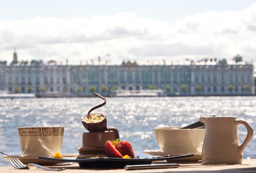 Кстати, это единственное место в Петербурге, где под плеск волн, можно насладиться чашечкой только что сваренного кофе, любуясь через панорамные окна на потрясающий вид акватории Невы и архитектурной композиции набережной.