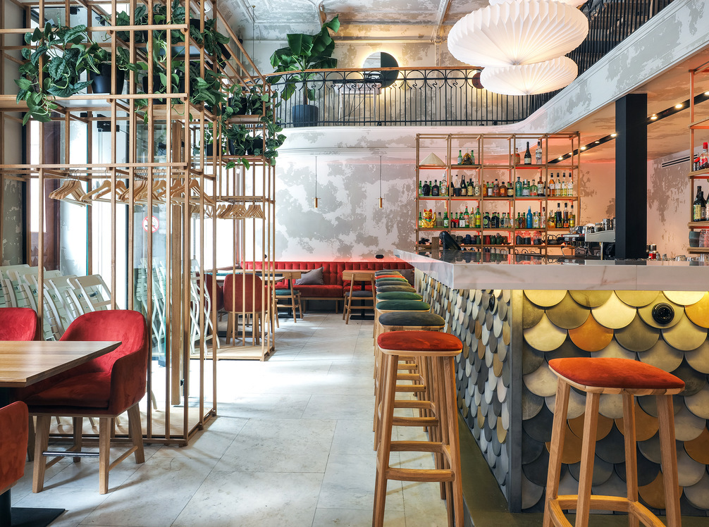Рестобар Made in China построили в двухэтажном светлом помещении на Б. Морской, в двух шагах от «Астории». Нетленку в виде помнящего февральскую революцию мраморного пола и столетней лепнины разбавили нарядными диванчиками и притворяющейся рыбной чешуей бетонной плиткой. В Made in China на аутентичность не замахиваются, скорей вокруг нее иронизируют и готовят азиатское попурри без размена на геополитические условности. В тарелках ассорти вкусов – Китай мешают с Японией, Францию с Кореей, Мексику с Китаем. Китайские булочки бао подают с рагу из говяжьих щек и ядреным южноамериканским чимичурри, глазированную свиную грудинку рифмуют с корейской капустой кимчи, мексиканское тако делают из теста, предзначенного для пельменей гедза, и заворачивают в хрустящую лепешку нежного краба и ломти манго. За ярким баром, над которым парят почти китайские зонтики, угощаться можно тоже вполне по-азиатски: японский саке, корейский соджу и стопроцентно made in China водка байдзю.