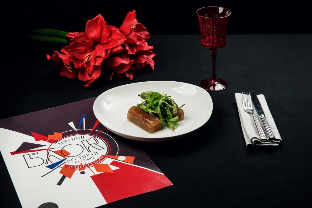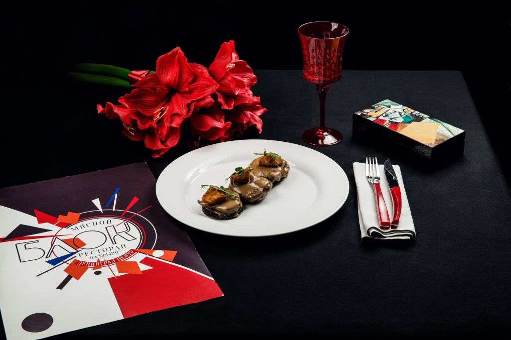 Ресторан «Блок» – ресторан в первую очередь мясной. По ведомству стейков проходит новинка: стейк трай-тип, который еще называют стейком св. Марии, сочный кусок мяса сопровождает сублимированное оливковое масло, похожее на настоящий снег. Из мраморной говядины делают бургер, из бычьих хвостов – холодец. Из редкого мясного специалиалитета – зобной железы взбивают паштет и украшают спонжами из свеклы и шпината и соусом из черной смородины. На десерт крем-карамель, украшенный чипсом из апельсина и свежими ягодами. Спецпредложение будет действовать до конца ноября.