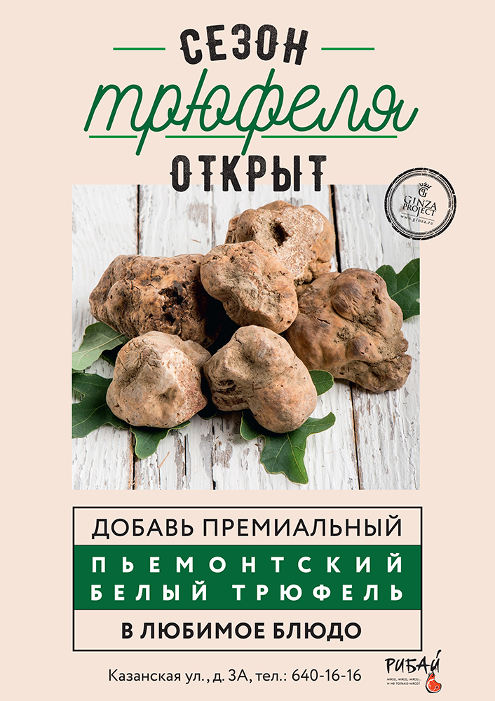 Ресторан «Рибай» приглашает гостей попробовать самый дорогой в мире гриб – белый трюфель из региона северной Италии – Пьемонт. От прочих его отличает тонкий аромат, напоминающий смесь чеснока и сыра и нежный, приятный, совершенно особенный вкус. Говорят, что отведав его хотя бы раз – забыть об этом просто невозможно, настолько он хорош! И теперь гости ресторана смогут в этом убедиться самостоятельно, по желанию добавив его в любимое блюдо. Наиболее удачной компанией к белым трюфелям считаются напитки, произведённые в том же географическом регионе, притом в идеале – красные вина Пьемонта. В разделе вин по бокалам в «Рибае» представлены: Barolo «Monfaletto» – Cordero di Montezemolo, а также Barbaresco «Vigneto Bordini» – La Spinetta урожая 2012 года. А в бутылке, кроме вышеперечисленных вариантов в меню есть Barbera d’Alba «Madonna Como» – Giacosa Fratelli.