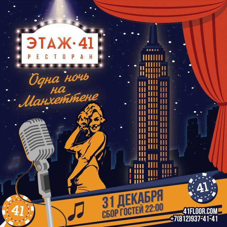 Провести новогоднюю ночь на Манхэттене мечтают многие, и ещё никогда мечта не была столь близка и доступна. 31 декабря в ресторане «Этаж 41» воцарится атмосфера Нью-Йорка ХХ века – именно в этой стилистике будут провожать год уходящий и встречать наступающий.