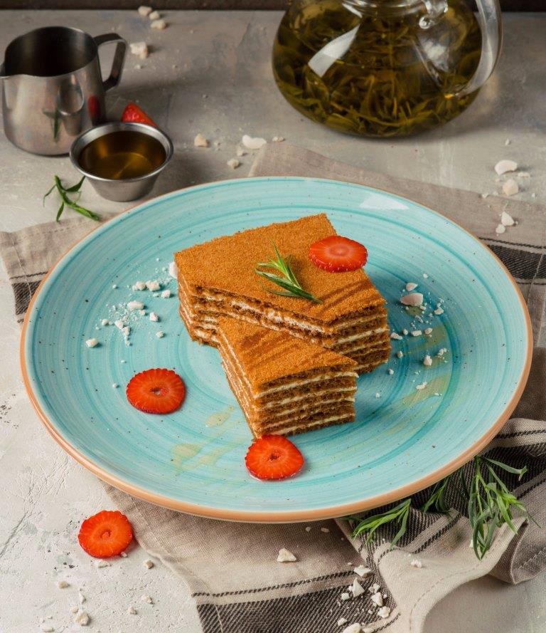 На десерт предлагаются торты: «Наполеон» и сметанник, рулет с фисташками и малиной, а также сливочное безе с соусом из свежих ягод.