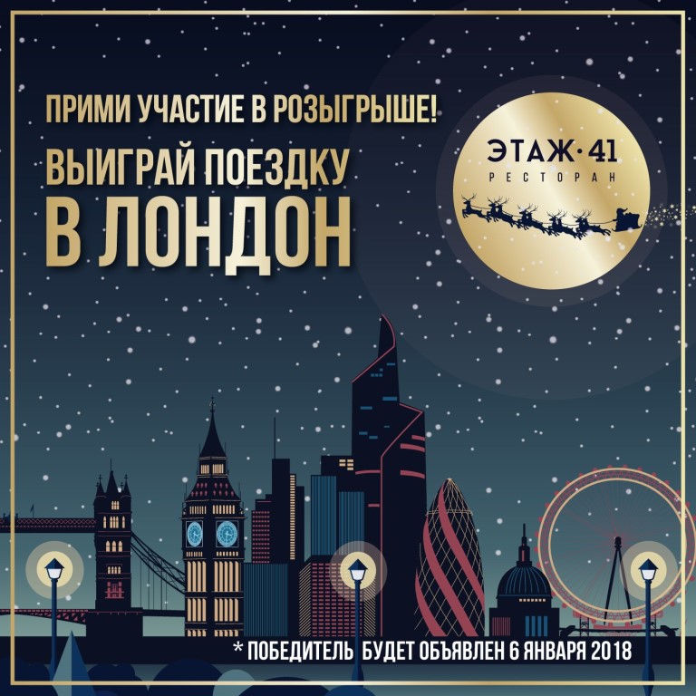 «Этаж 41», самый высокий ресторан в Северной Европе и Санкт-Петербурге, проведет 6 января рождественский розыгрыш. Два счастливчика отправятся в четырехдневную поездку в Лондон, где будут жить в шикарном пятизвездочном отеле.
